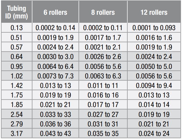 아래 표는 튜빙 사이즈에 따른 유량 범위입니다.