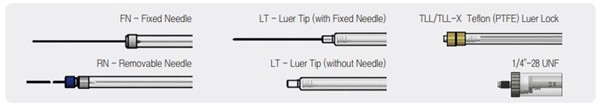 바늘이 고정되어 붙어있는 FN 타입/ 바늘을 교체할 수 있는 RN 타입/ Luer Lock 타입/ Luer Tip 타입 등 다양하게 선택할 수 있습니다.