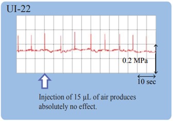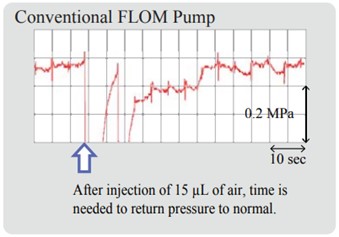 데이터에서와 같이 15ul의 공기가 주입 되었을 때 UI-22 시리즈에서는 압력 변동이 거의 발생하지 않음에 비해 기존 flom 펌프에서는 정상상태로 회복되는데 상당한 시간이 걸리는 것을 볼 수 있습니다.