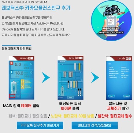 레보딕스 초 순수 제조장치 사용하신 고객님에게 필터 교체 알람을 알려 드려 교체 주기 일정을 카톡으로 알려드립니다~!