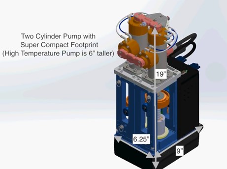 Vindum의 VP 시리즈 듀얼 실린더 펌프는 9 x 6.25 x 19” 의 사이즈로 성능에 비해 초소형으로 디자인되었습니다. (고온 사양은 6” 더 높습니다)_