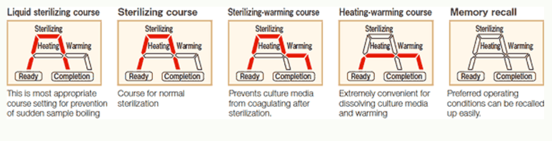 액상 멸균 코스, 일반 멸균 코스, 멸균 후 가열 코스, 가열 코스, 저장된 메모리 불러오기 기능으로 사용자의 선택에 따른 멸균 코스를 제공합니다.