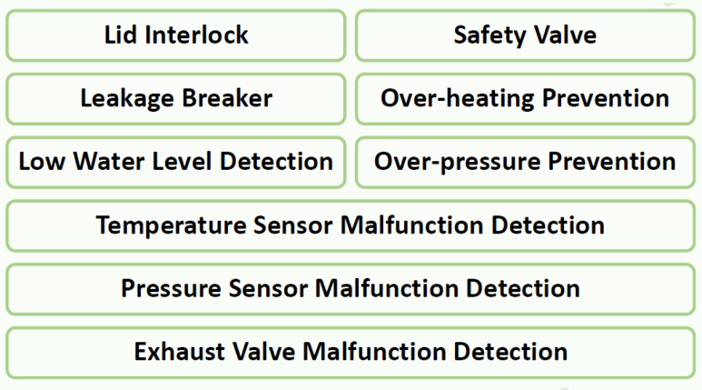 : 안전밸브, 과열 방지, 과압 방지, 누전 차단, 수위 감지, 온도 및 압력 센서 오작동 감지, 배기밸브 오작동 감지, 도어 센서