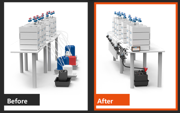 기존 방식은 왼쪽 사진과 같이, HPLC 장비의 대수만큼 폐액통과 폐액라인을 구비하여 각각 관리해 주어야 합니다.