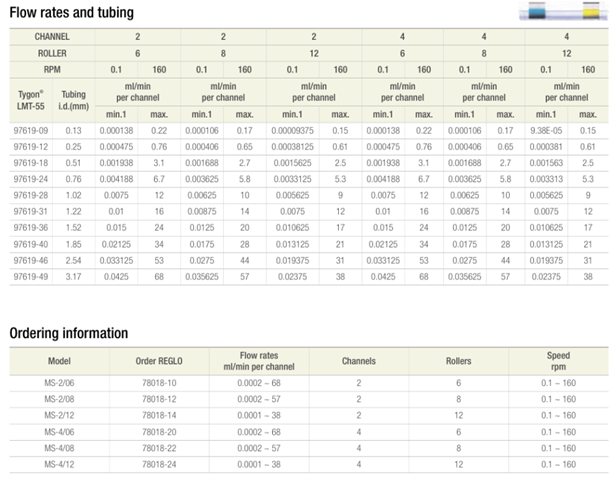 Masterflex 전용의 3-stop 튜빙을 선택하여 사용하는 멀티채널 튜빙펌프입니다.