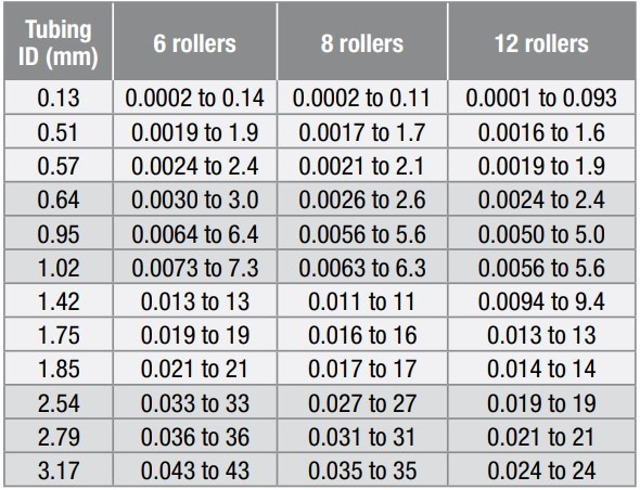 사용하는 튜빙의 내경에 따른 flow rate표는 아래와 같습니다.