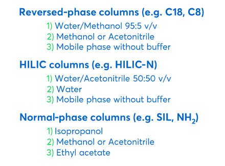✔ 사용 후 완충액 제거 → 테스트 크로마토그램에 기재된 용매로 세척 및 보관