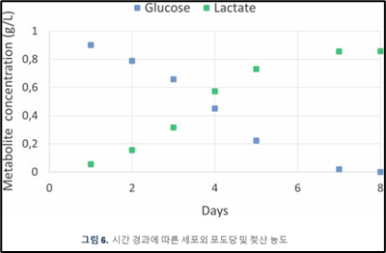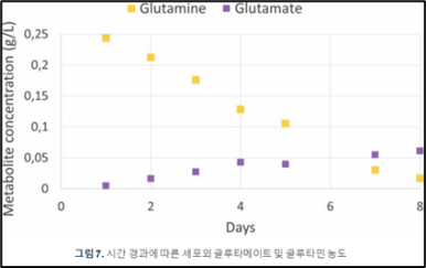 • 글루타민 농도: 8일 차에도 소진되지 않음 → 제한 인자 아님 확인