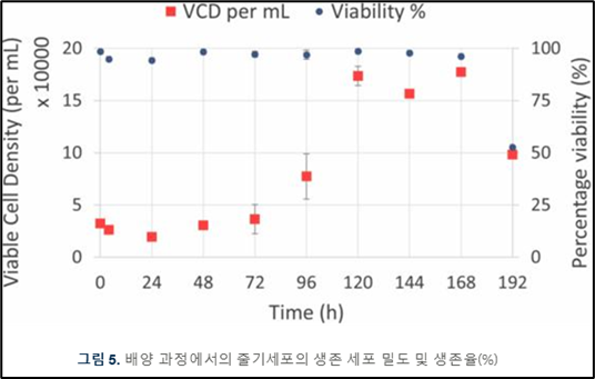 • 5일 차: 세포 농도 1.8×10⁵ cells·mL⁻¹, 생존율 97% 유지
