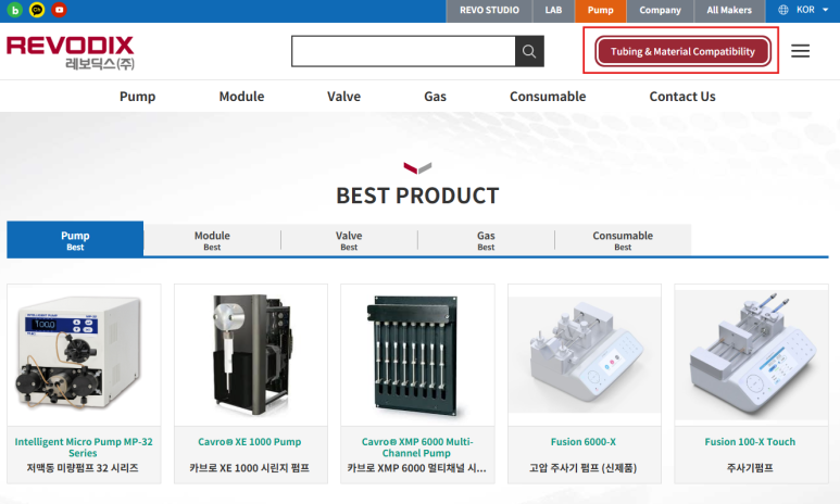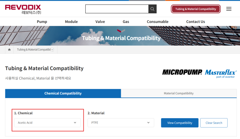 레보딕스 홈페이지 Tubing & Material Compatibility 페이지 소개