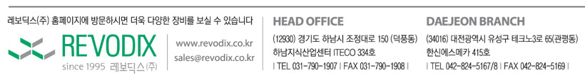 레보딕스㈜ | 신종훈 | 경기도 하남시 조정대로 150 하남지식산업센터 아이테코 334호 | 사업자 등록번호 : 206-86-21780 | TEL : 031-790-1907 | Mail : sales@revodix.co.kr | 통신판매신고번호 : 호 | 사이버몰의 이용약관 바로가기