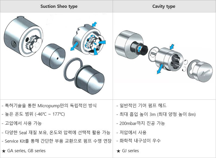 Cavity type은 일반적인 기어펌프의 형태이며, Suction shoe type은 마이크로 펌프사의 고유한 특허 기술입니다.^^