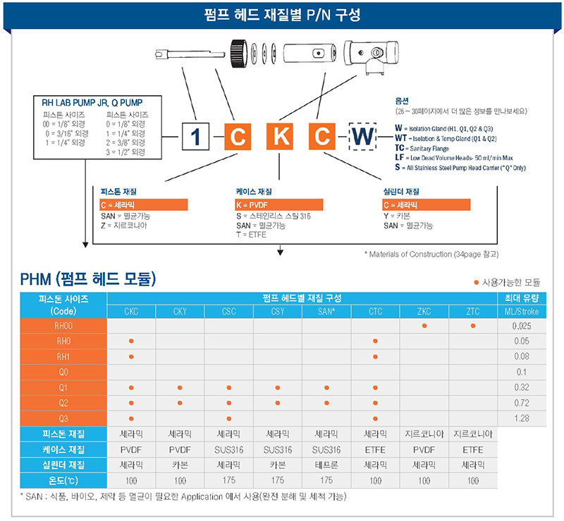 FMI사의 대표적인 Pump Head을 선택하려면, Pump Head 재질별 파트넘버 구성 방법을 알아야 합니다.