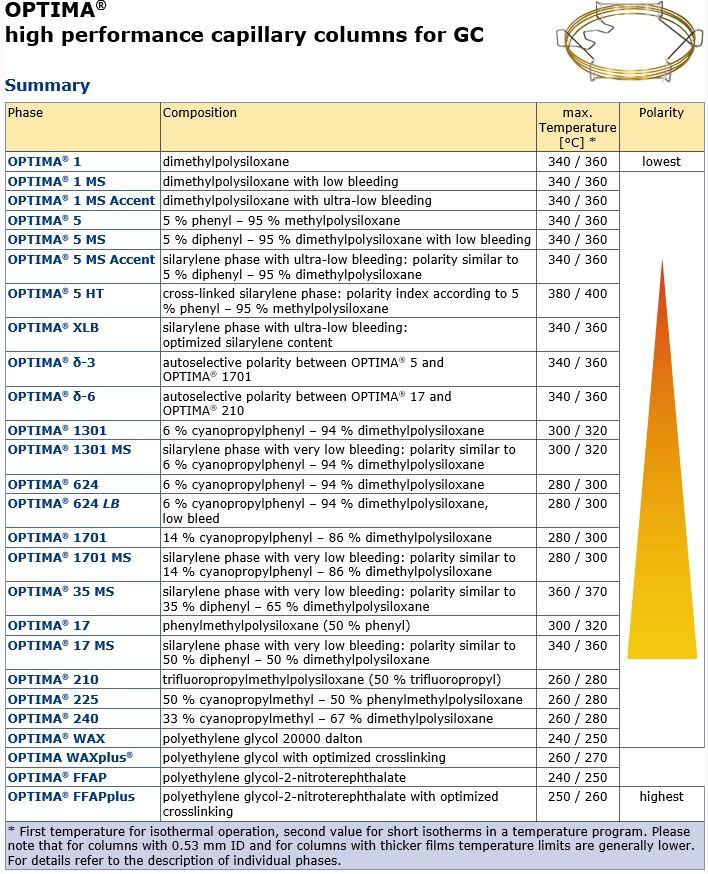 OPTIMA® GC 컬럼은 위와 같은 특징을 갖고 있으며 다양한 Phase의 컬럼을 보유하여 실험 용도에