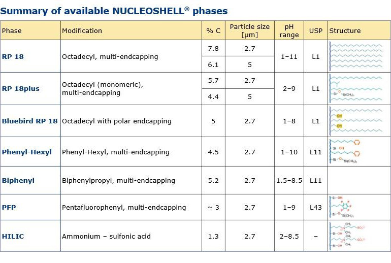 위의 특징과 함께 NUCLEODUR® 컬럼 또한 다양한 고정상 제품을 보유하고 있습니다.