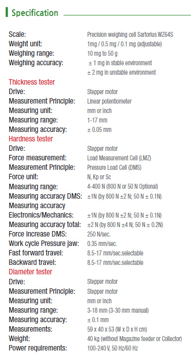 UTS 4.1 제품은 사용자가 직접 설정한 정제의 무게, 두께, 길이, 넓이, 경도를 자동으로 측정하여 데이터를 저장합니다.