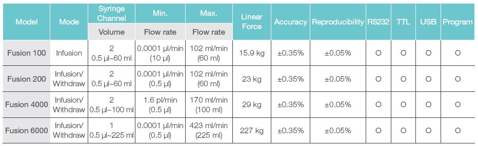 특히 Fusion 시리즈는 모터의 진동이 미세하여 안정적인 Syringe Pump로 인정받고 있습니다!