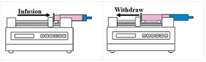 Chemyx사의 Syringe Pump는 주입(Infusion)방식과 흡입(Withdraw)방식의 동작을 합니다.
