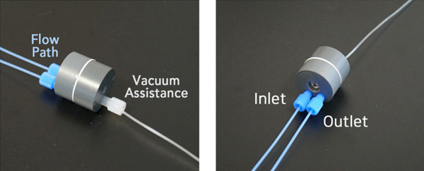 이 미세 유체 버블 트랩은 수동 모드와 진공 라인을 추가할 수 있는 활성 모드의 두가지 모드에서 사용할 수 있습니다. 이 두가지 모드에서 미세 유체 압력 제어기와 같은 압력 발생기의 진공 출구는