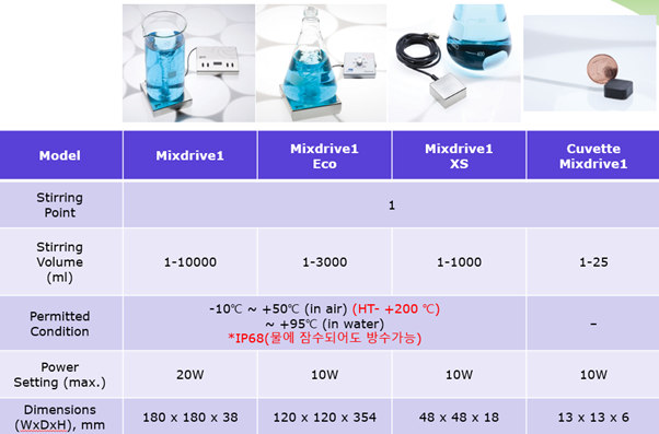 MIX1 제품이외에도 Single Magnetic Stirrer 제품군 다음표와 같습니다.