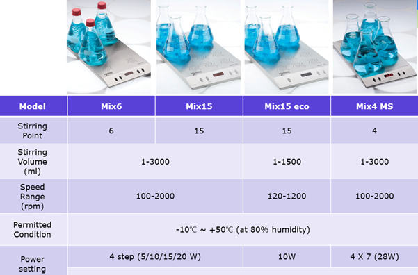 MIX15 제품 이외에도 Multi magnetic stirrer 제품군은 다음표와 같습니다.