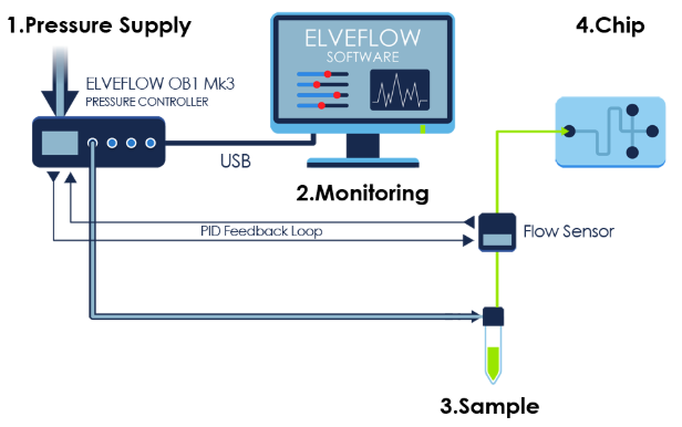이 MFS 유량 센서는 모든 압력 컨트롤러 시스템 (OB1, AF1 – 블로그를 참조해주세요)과 연결하여 사용 가능합니다. 피드백 루프를 사용하여 미세 유동 설정에서 유량을 모니터링하고 제어하면서 압력 구동 유량의 안정성과 응답성을 유지할 수 있습니다.