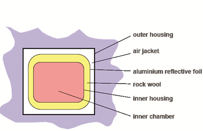 Inner housing, rock wool, aluminium reflecive foil, air jacket, outer housing의 5단계의 단열방식으로