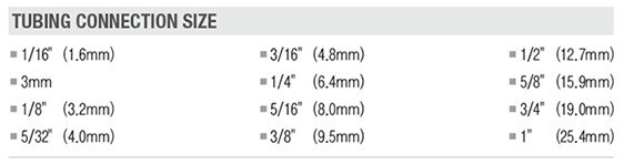 Linktech의 제품에서 연결이 가능한 Tubing size는 아래와 같습니다.