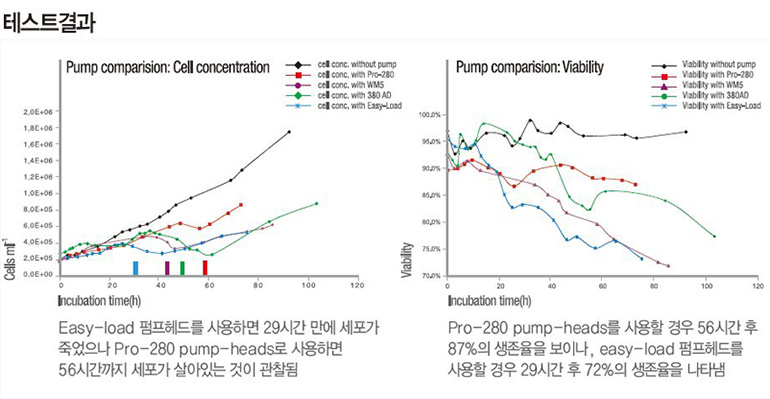 테스트 결과에서 볼 수 있듯이 ISMATEC사의 Pro-280 pump head를 사용한 튜빙 펌프는
