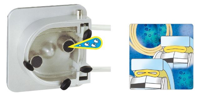 Roller가 완전히 압착된 튜브를 닫기 전에 세포는 위의 그림처럼 튜빙의 빈 틈새를 통해 통과할 수