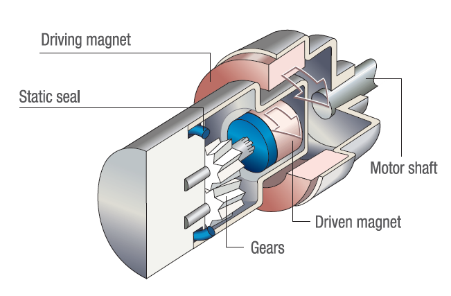 물리적인 접촉없이 Driven magnet과 Gear가 회전하는 방식입니다.