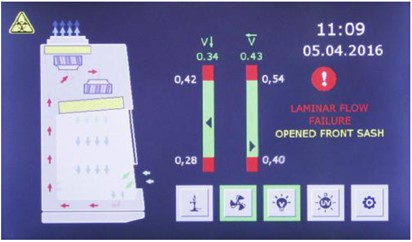 컨트롤러부는 Full Touch Screen으로 조작이 간편하며, 사용중 실시간으로 공기의 흐름과 속도를 표시해주며, 제품의 알람 발생시 즉각적으로 화면에 표시됩니다.