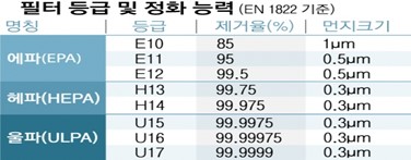 HEPA필터는 까다롭기로 유명한 유럽의 EN 1822-1(고효율공기필터에 대한 분류, 효율, 테스트) 인증을 거친 H14등급의 필터가 장착되어 있으며 필요시 옵션사항으로 ULPA필터의 장착도 가능합니다.