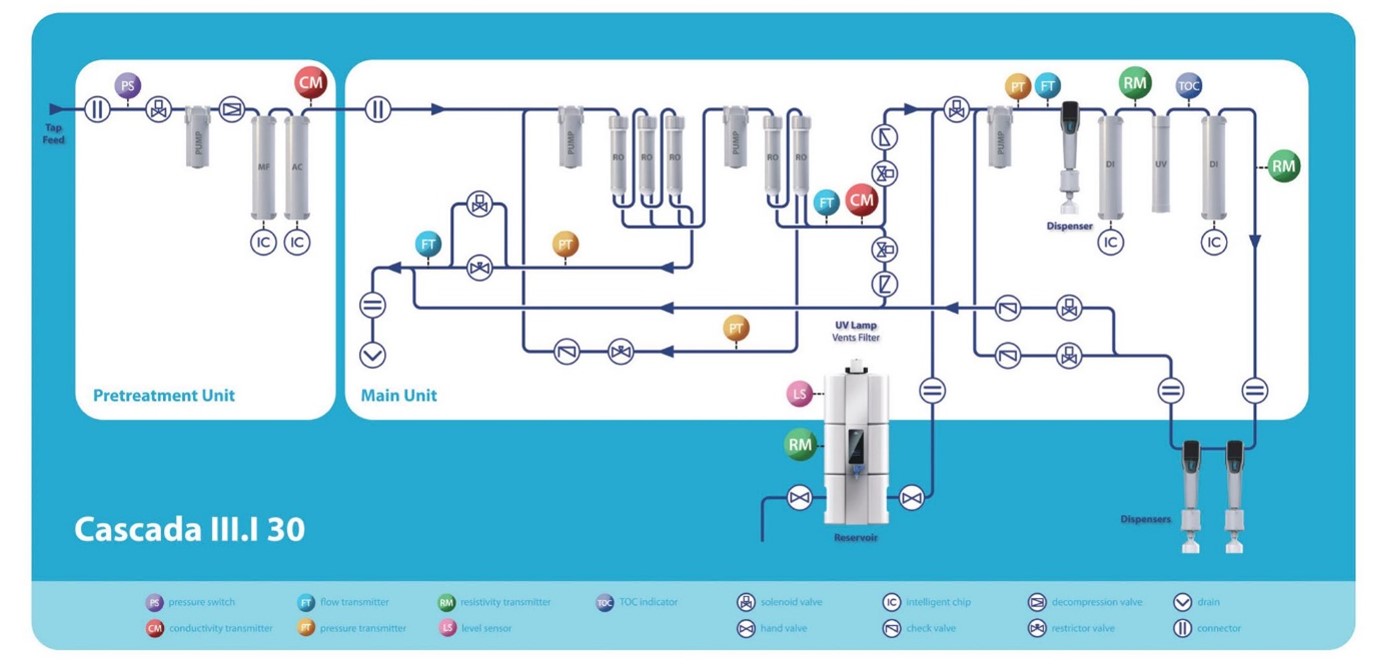 Cascada™ Ⅰ 시스템을 통해 생산되는 TypeⅠ water는 ASTM, CAP, ISO 3696, CLSI, JIS K0557 및 USP,