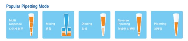 l 5가지 모드 : Pipetting, Reverse Pipetting, Multi-Dispense Pipetting, Diluting and Mixing