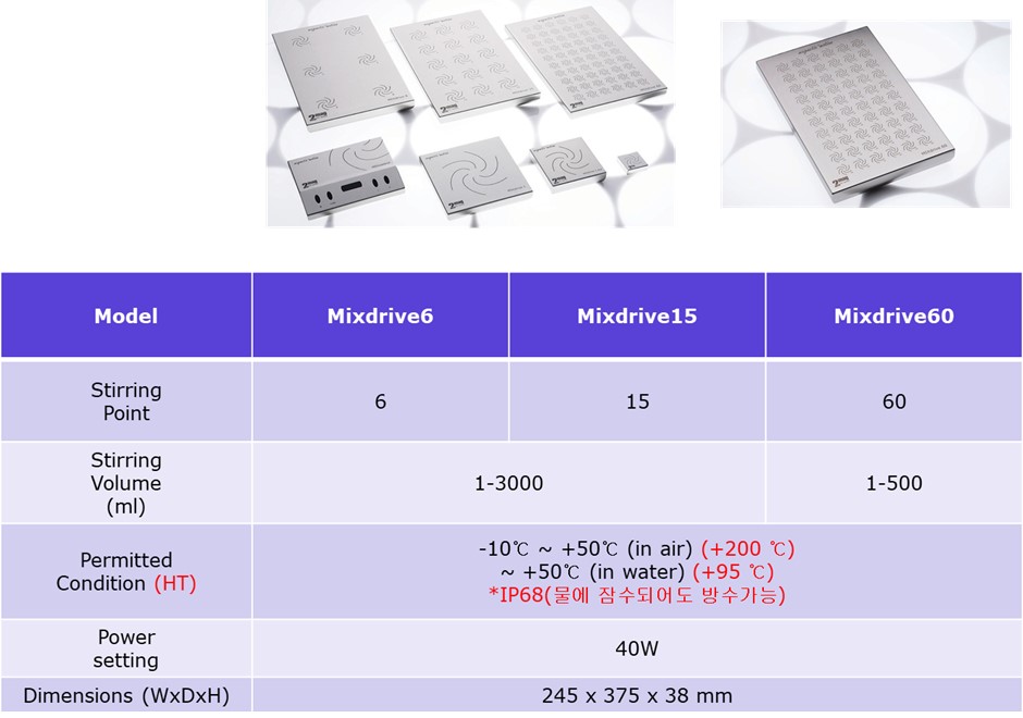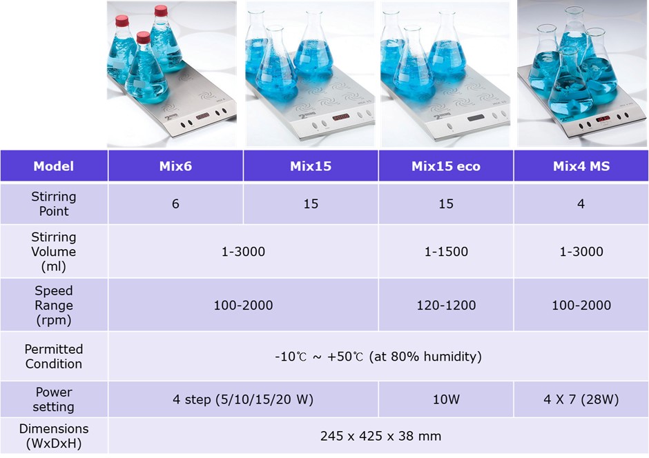 MIX6 제품이외에도 Multi Magnetic Stirrer 제품군 다음표와 같습니다.