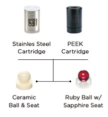 Stainless Steel 카트리지 및 PEEK 카트리지는 Ruby Ball & Sapphire seat 조합으로도 제공 될 수 있습니다.