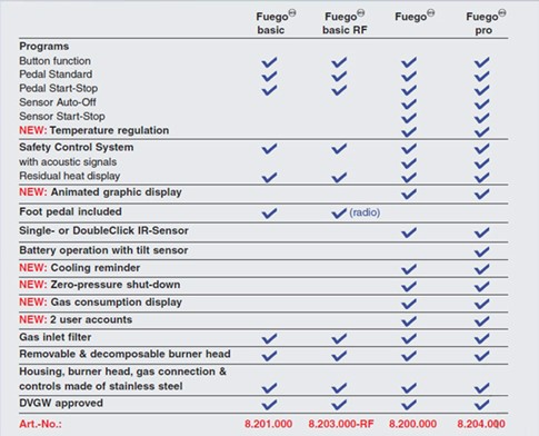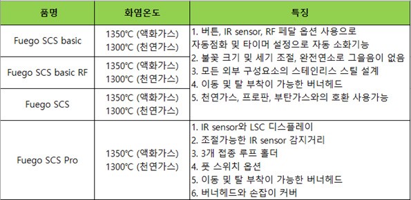 Fuego 시리즈의 경우 온도제어나 풋페달 유무, 음성인식 기능 유무 등에 따라 제품군이 다양합니다.