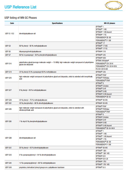미국 약전에서는 여러가지 실험 방법에 적합한 컬럼을 지정하고 있으며
