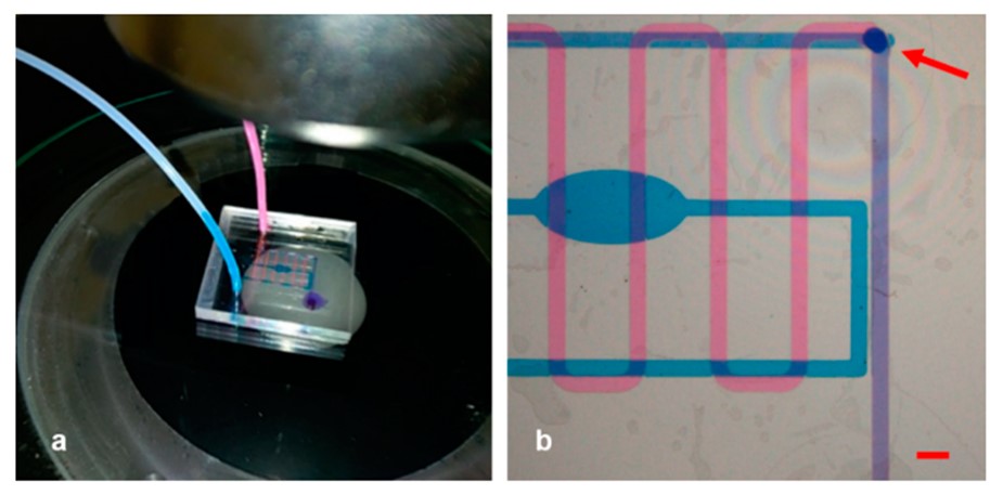 사진에서와 같이 3D microfluid mixer의 mixing 효율과 성능을 확인하기 위한 실험 세팅에 MK3+가 사용 되었습니다.