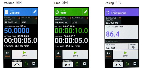 이 제품에는 Volume, Time, Dosing모드가 있습니다.