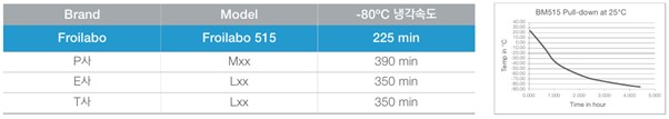 2. 빠른 냉각 속도 (Cool Down time) : Power fail / Door Open 후에도 빠른 온도 회복과 타사대비 빠른 목적 온도 도달(515 Model : -80℃ 도달 시간 225분)
