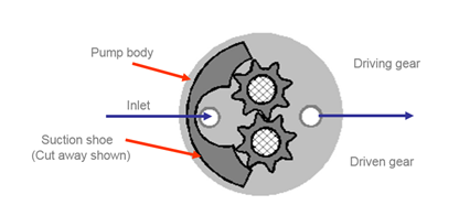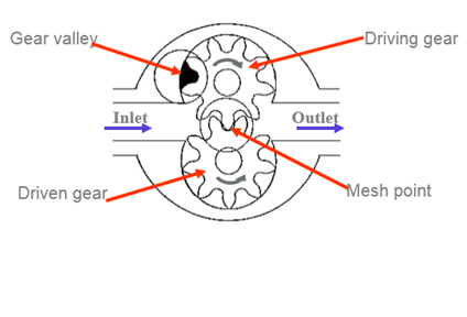 그림에서 보시듯 Inlet 포트로 흡입된 유체는 기어가 회전함에 따라 기어 이빨과