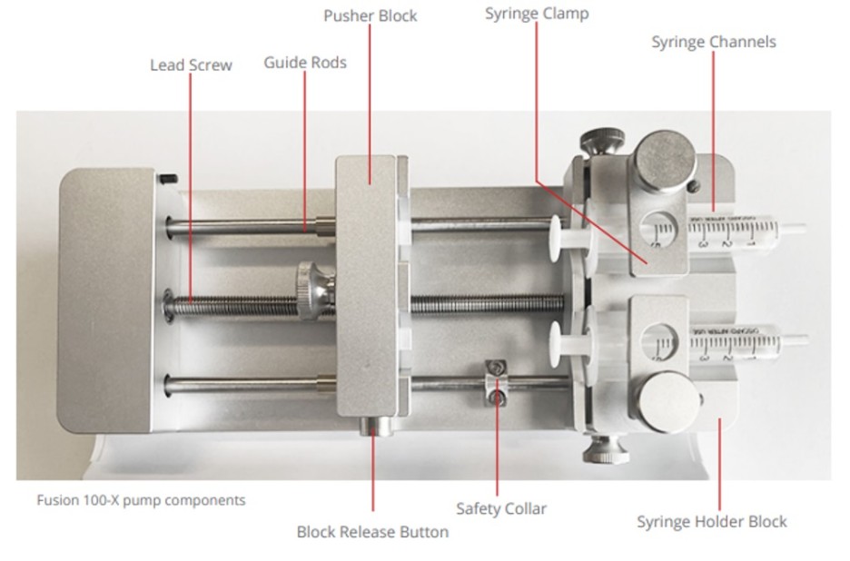 푸셔 블록은 주사기 플런저를 밀어서 유체를 토출합니다.