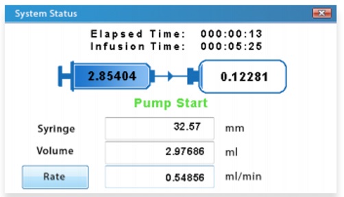 시스템 작동 상태 화면에서는 경과 시간, 주입 시간, 주사기 볼륨, 전달 부피, 이송 방향, 설정된 변수 등의 정보를 직관적으로 나타냅니다.