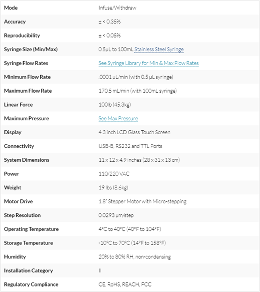 - Flow rate from 0.0001 µL/min to 170.5 mL/min
