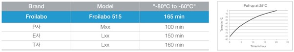 2. 빠른 냉각 속도 (Cool Down time) : Power fail / Door Open 후에도 빠른 온도 회복과 타사대비 빠른 목적 온도 도달(515 Model : -80℃ 도달 시간 225분)