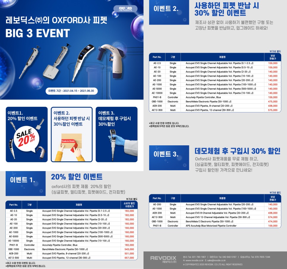 현재 레보딕스에는 옥스포트 피펫보상 이벤트, 직접 사용할수 있는 데모 이벤트, 할인이벤트를 진행하고 있습니다. 고장나거나 오래된 피펫을 반납시 30% 할인된 가격으로 피펫을 구매 하실 수 있습니다.