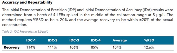 위 실험에서 %RSD는 20%이하, 평균 recovery는 실제 농도의 ±20% 이내 여야 합니다.