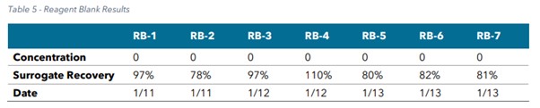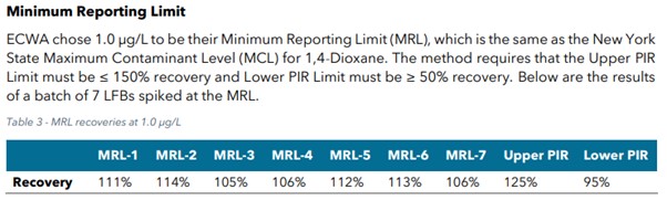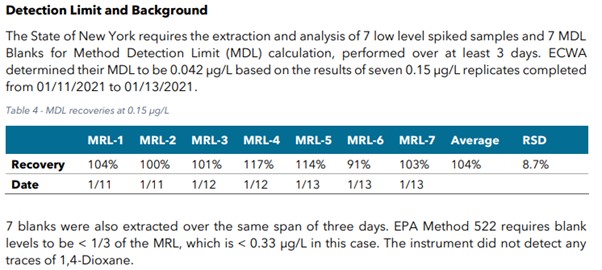 위 실험에서 1,4-Dioxane의 MRL은 1.0 µg/L로 설정되었으며